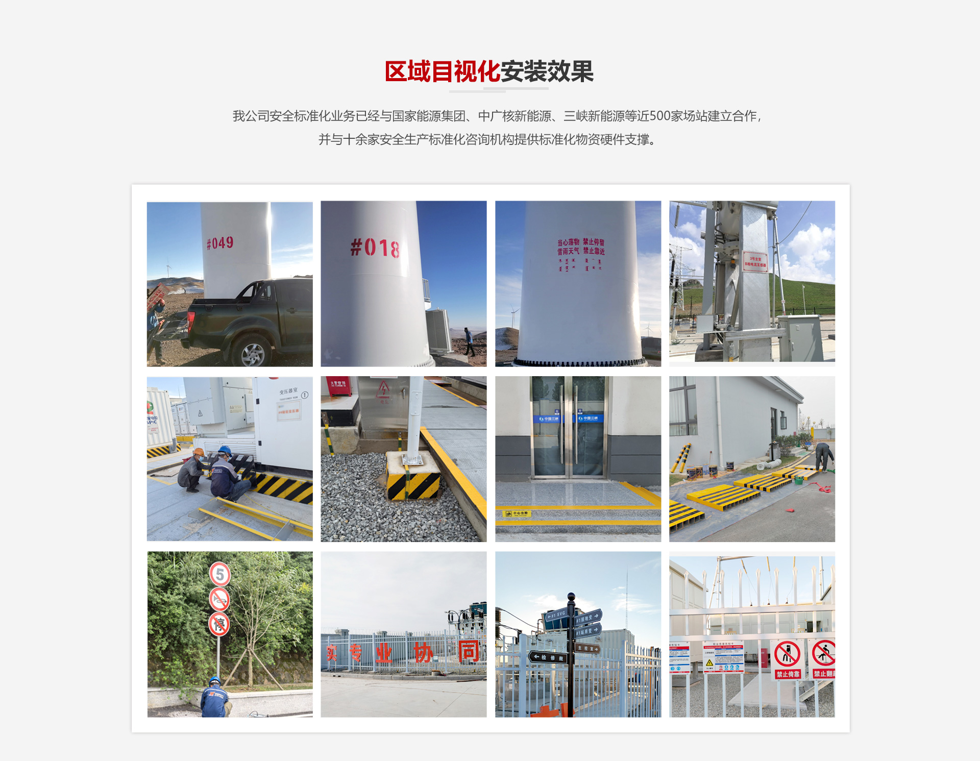 我公司安全標準化業務已經與國家能源集團、中廣核新能源、三峽新能源等近500家場站建立合作,并與十余家安全生產標準化咨詢機構提供標準化物資硬件支撐。