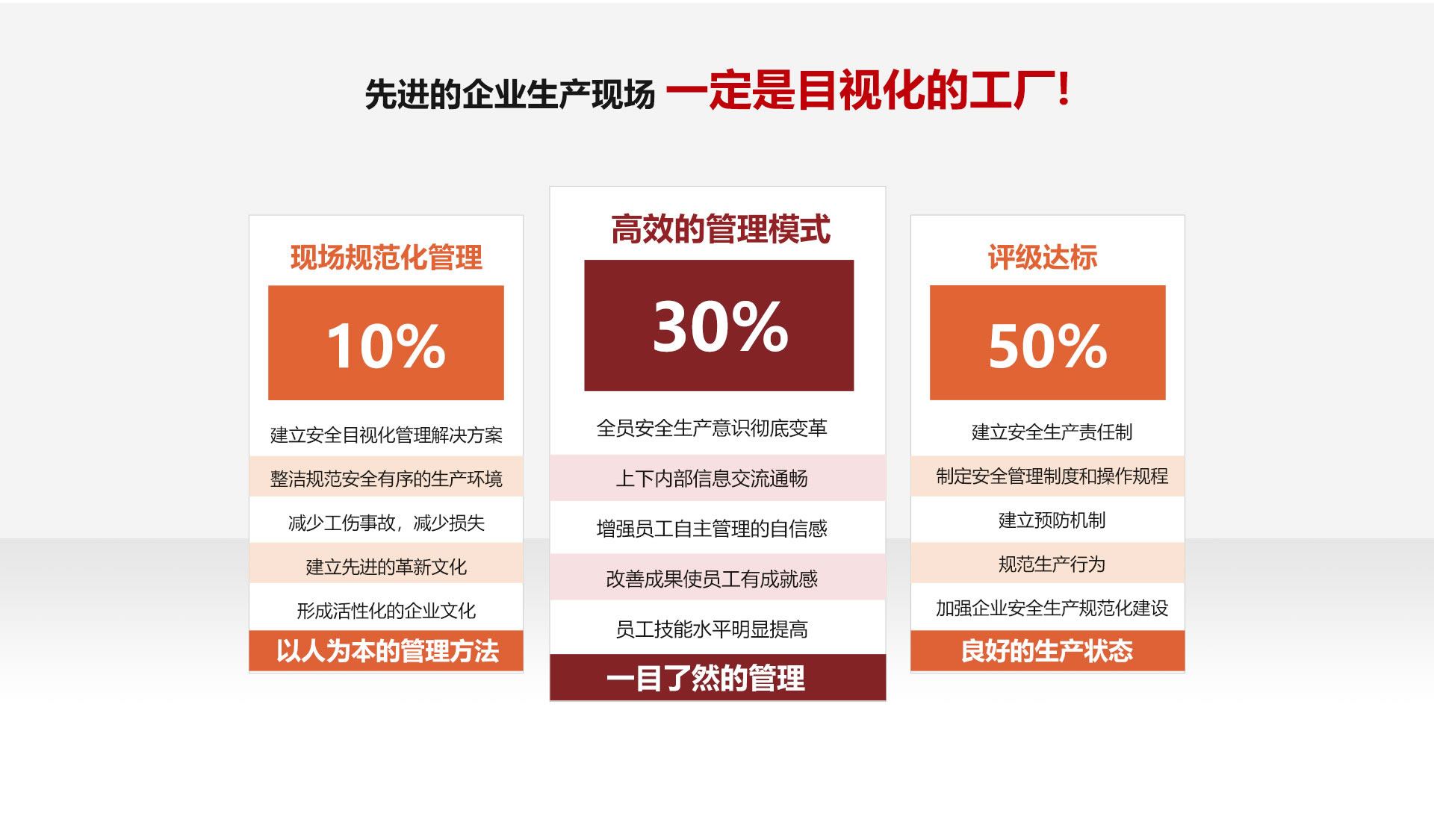 華泰安全目視化管理以安全法律、法規、標準和危害識別風險評價為基礎,運用標識警示、6S管理、看板管理、定置管理等方法,結合企業VI、生產的特點、安全管理現狀,將各方內容融合,策劃一套系統的安全目視化管理解決方案。