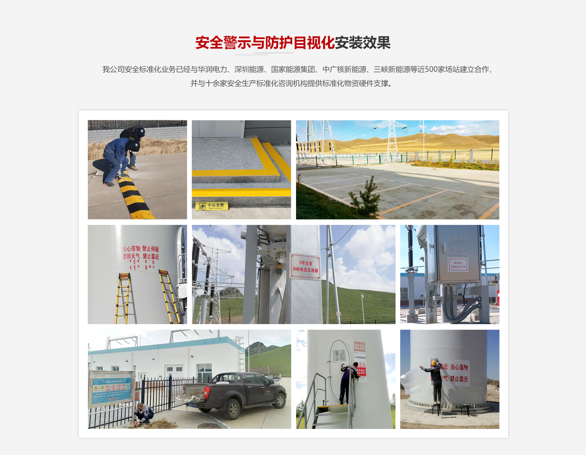 我公司安全標準化業務已經與國家能源集團、中廣核新能源、三峽新能源等近500家場站建立合作,并與十余家安全生產標準化咨詢機構提供標準化物資硬件支撐。